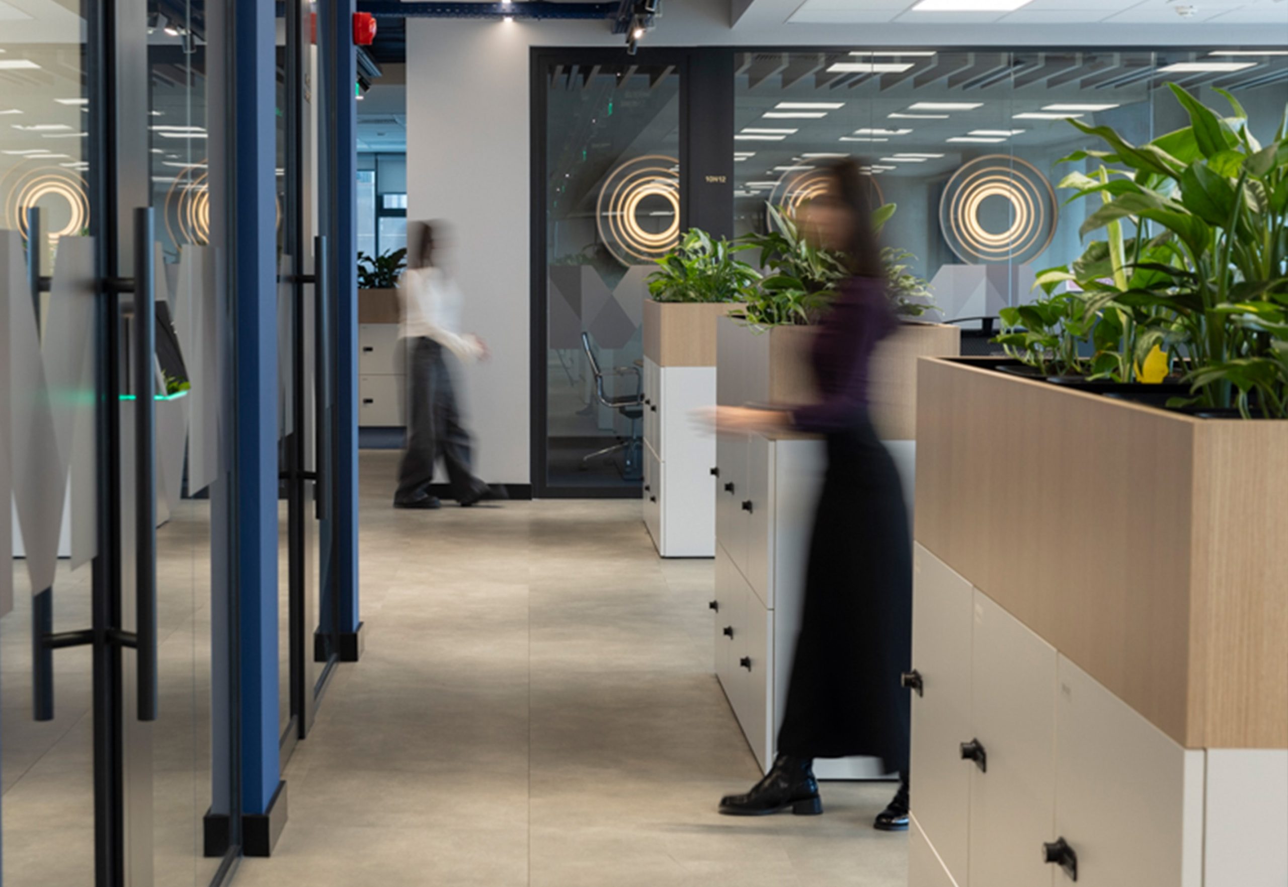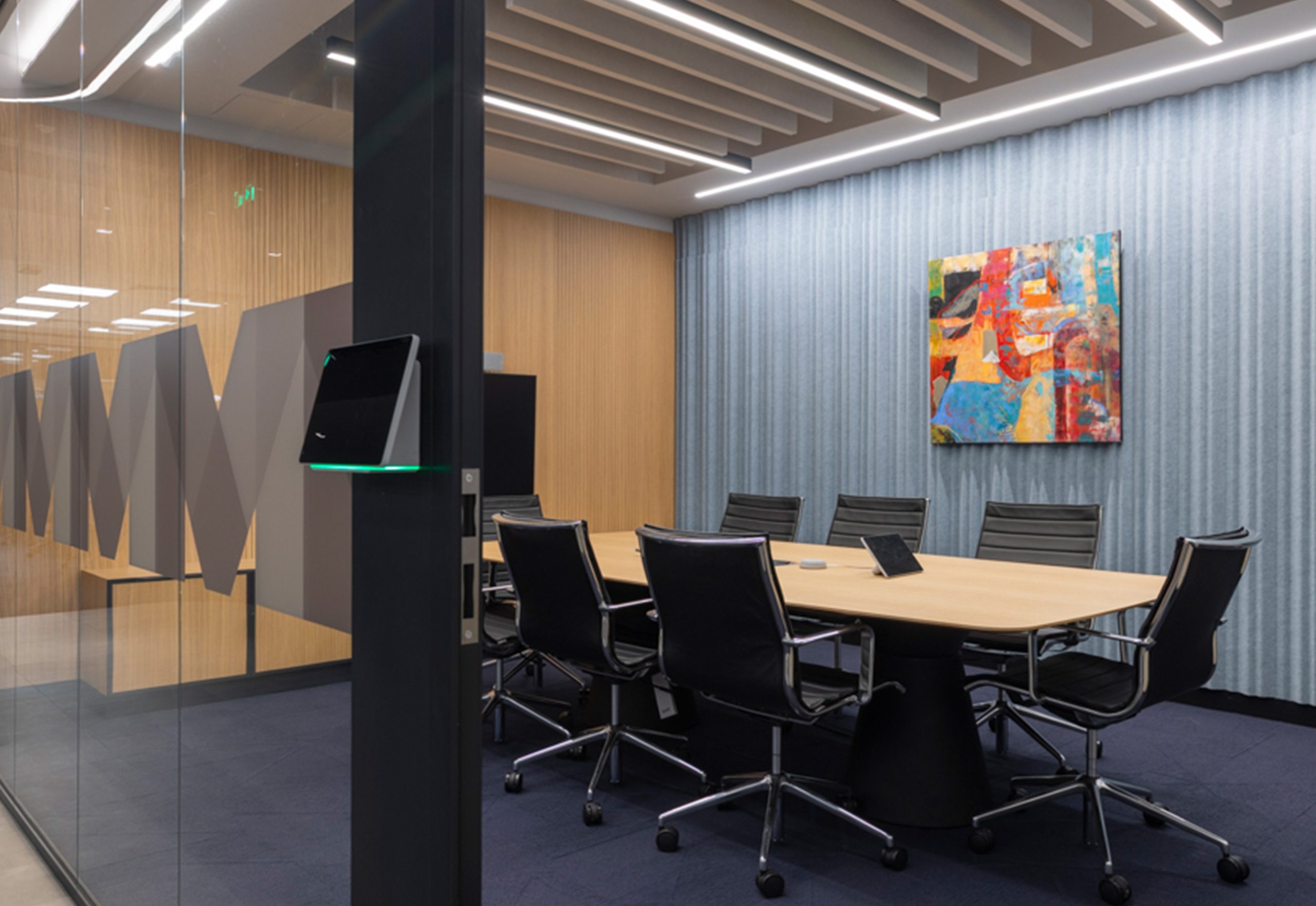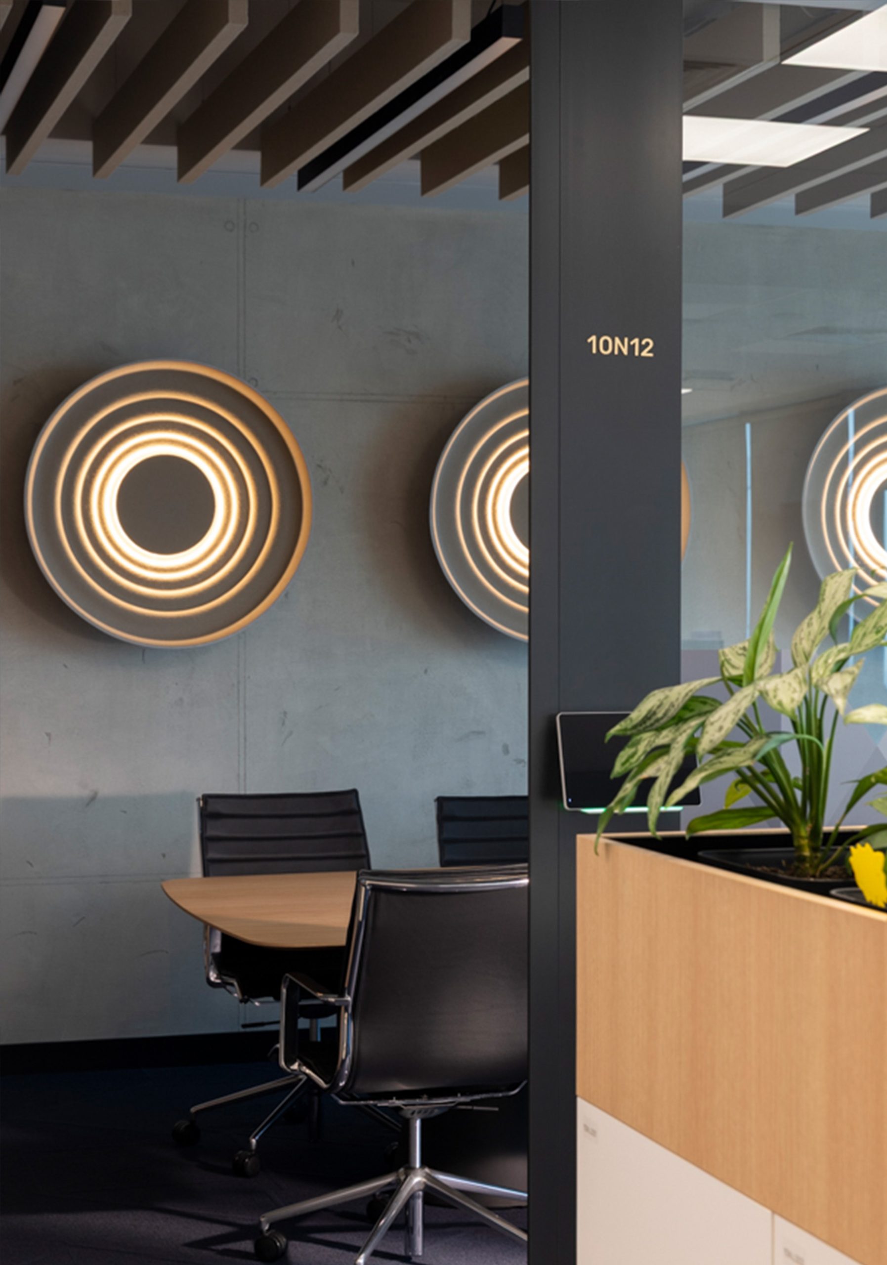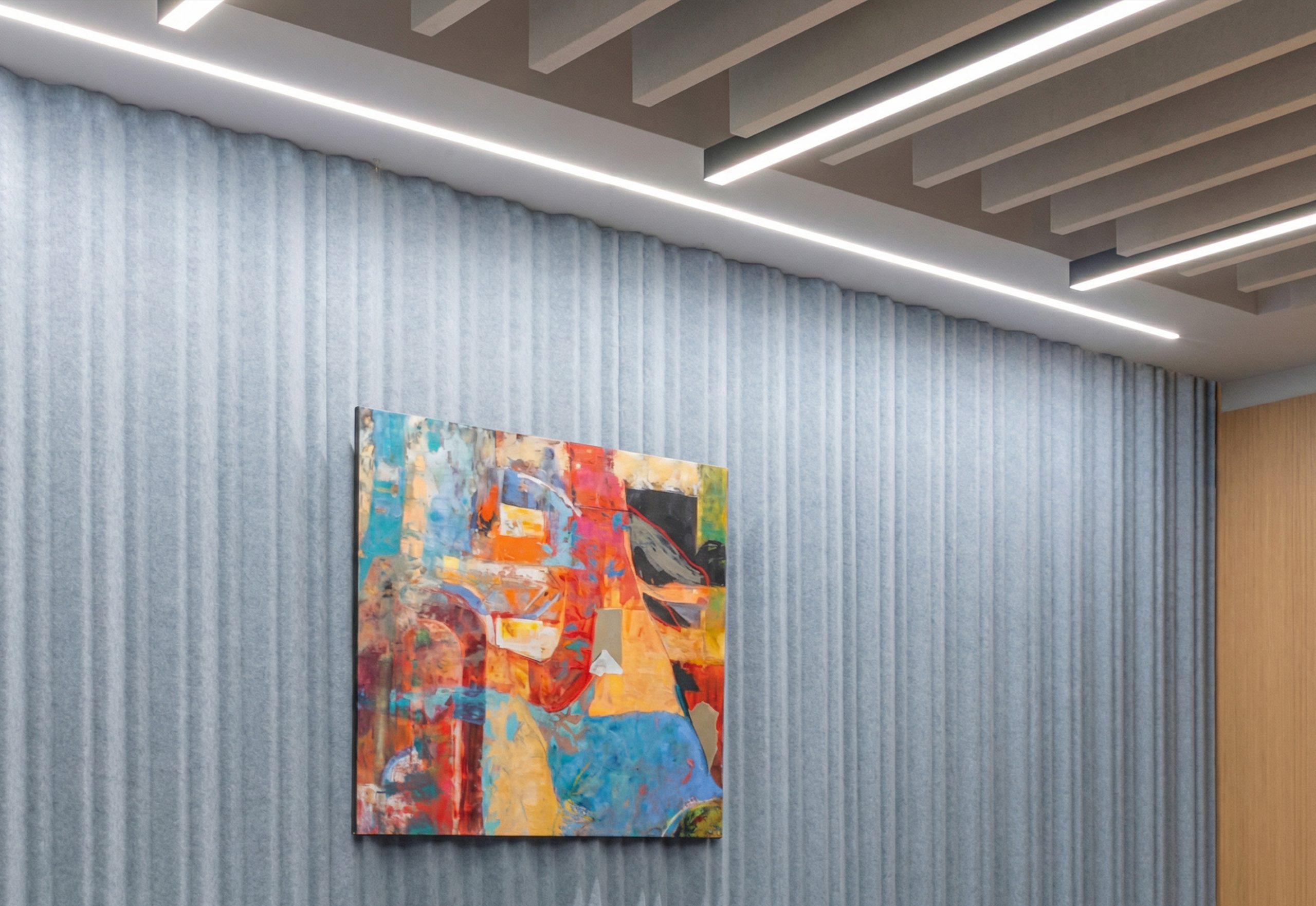 The design team uses Ripple wall-mounted lighting panels in the meeting rooms. These panels add soft light and create a calm atmosphere. At the same time, they help control sound and improve speech clarity.