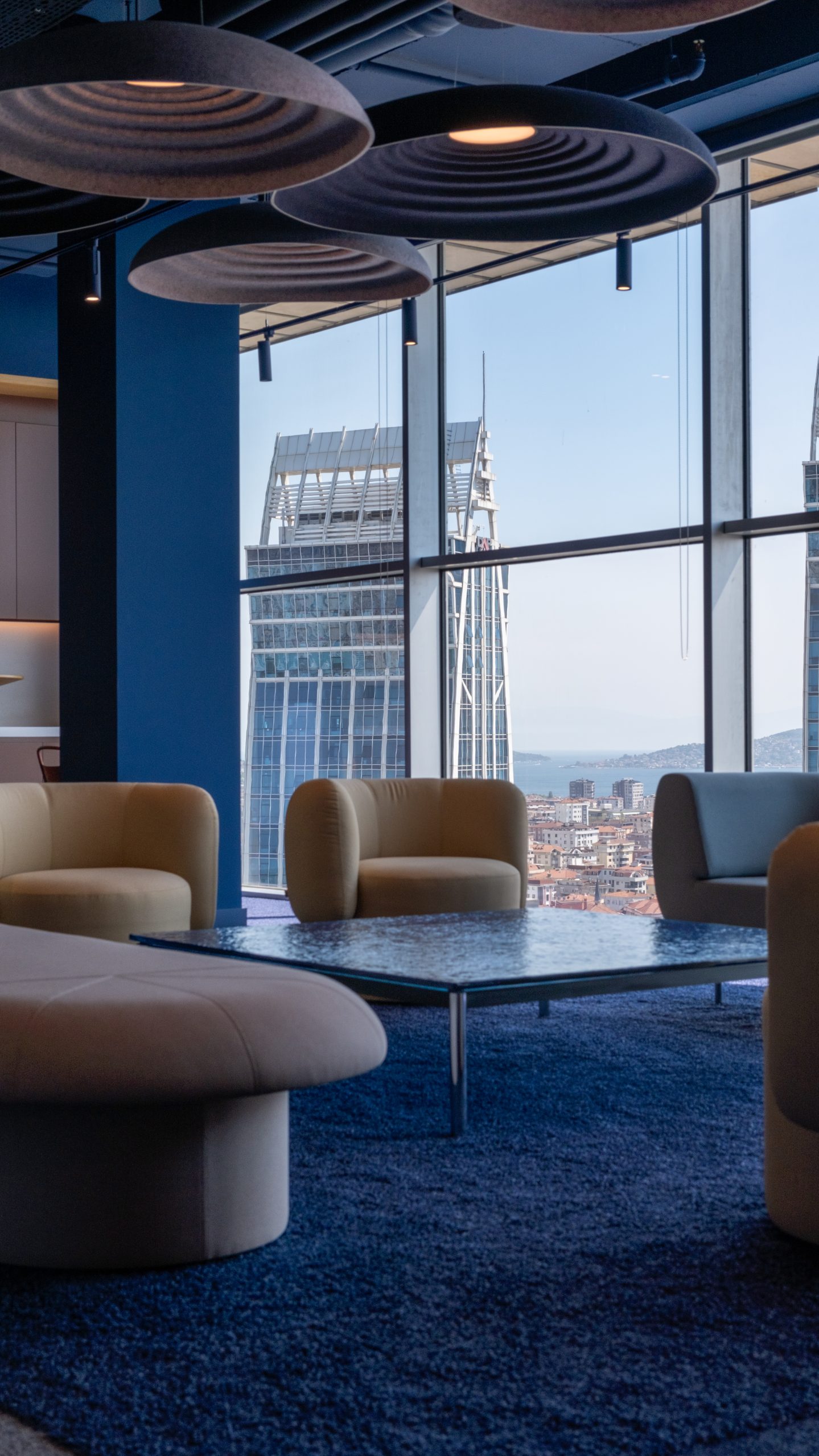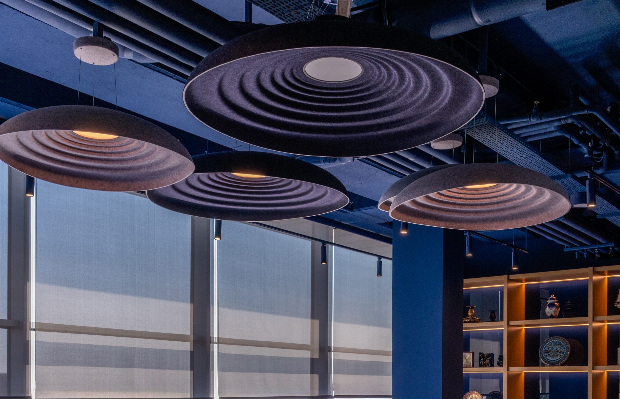 The lighting solution, Ripple, with its wave-like design, adds an aesthetic touch to the space while reducing sound reflections and reverberations, enhancing focus. Another acoustic wall solution, Octopus panels, meets both the aesthetic and functional needs of the office, adding elegance while balancing acoustics within the workspace. Used in ceiling applications, Wave Baffle effectively absorbs sound reverberation with its wave design, maintaining sound balance throughout the office and bringing a sense of visual movement, creating a refreshing and open atmosphere.
