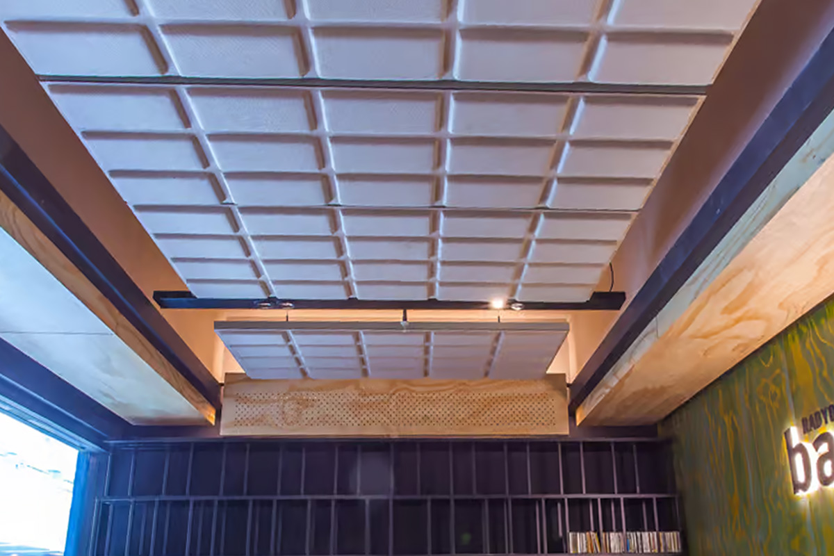 The acoustic strategy focuses on controlling reverberation time while keeping a strong visual identity. Frequency and Plate wall panels absorb sound reflections and reduce background noise on vertical surfaces. Suspended Bitter panels control sound from above and support a balanced acoustic environment.